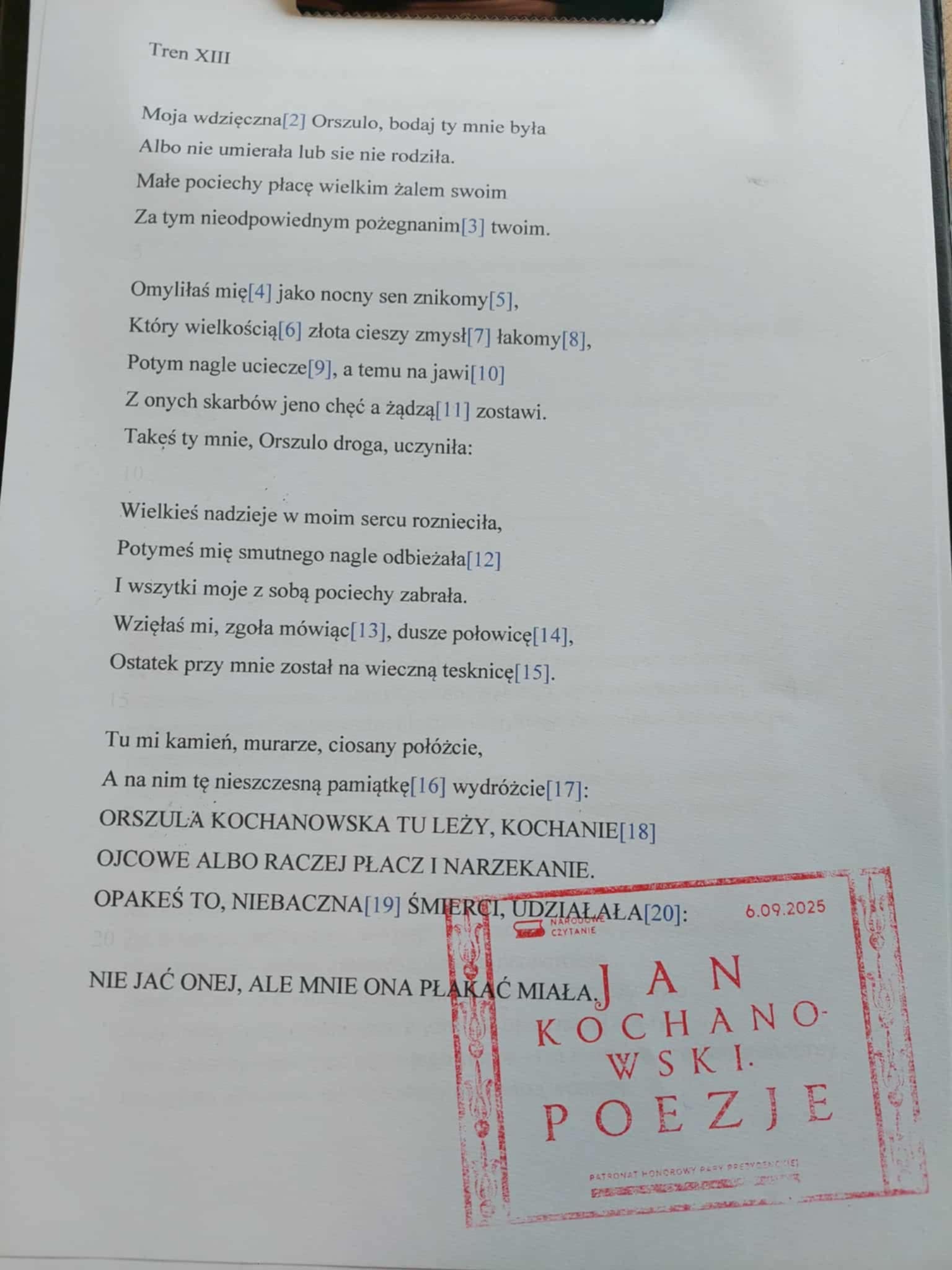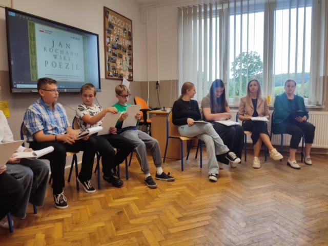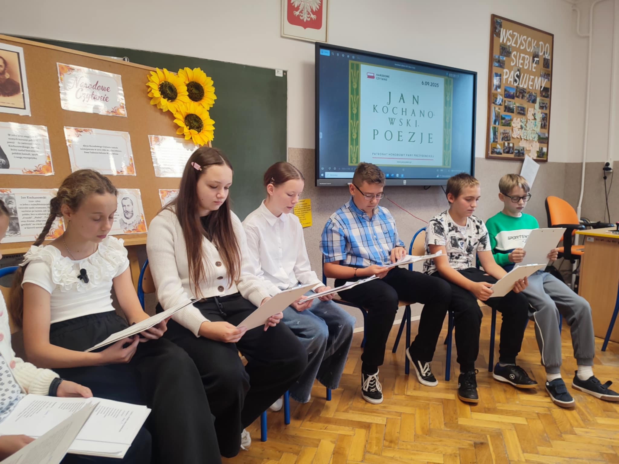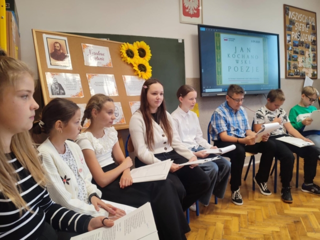 Ta akcja stała się ważnym wydarzeniem w naszym szkolnym kalendarzu. Tym razem to uczniowie klas VI- VII pod okiem nauczycieli polonistów, wzorowo zaprezentowali twórczość Jana z Czarnolasu. Nie zabrakło pieśni, fraszek, trenów, które podkreśliły mądrość humanisty oraz jego żartobliwy dystans wobec świata. Kochanowski potrafił pisać o powadze ludzkiego losu, ale i o codziennych radościach, czy słabościach. Utwory te stały się również wyzwaniem dla młodych czytelników pod względem dykcji i poprawnej wymowy.