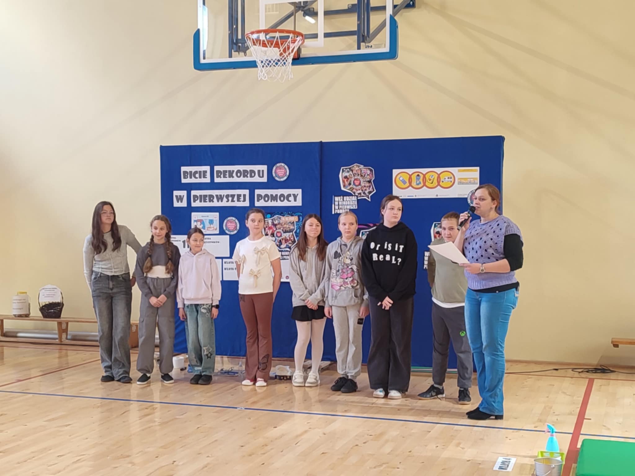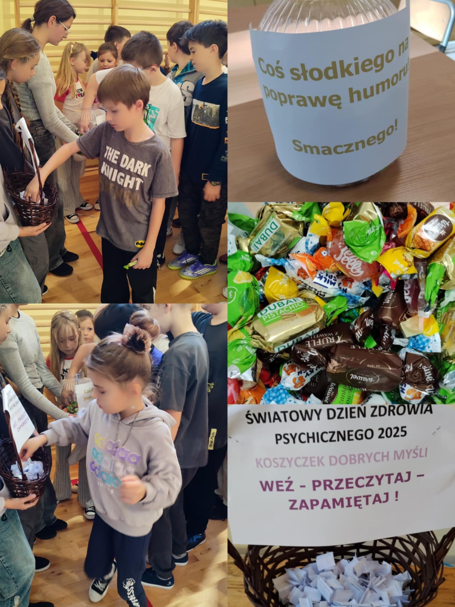 Podczas apelu głos zabrali również Szkolni Mediatorzy, którzy przygotowali krótką prezentację na temat sposobów troski o zdrowie psychiczne. Uczniowie przypomnieli swoim kolegom i koleżankom, jak ważne jest wsparcie ze strony innych osób, rozmowa o emocjach oraz poszukiwanie pomocy w trudnych chwilach. Na zakończenie spotkania Mediatorzy we współpracy ze szkolnym pedagogiem przygotowali wyjątkową niespodziankę – symboliczne „częstowanie” dobrymi słowami. Każdy uczeń mógł sięgnąć do specjalnego koszyczka i wylosować karteczkę z pozytywną sentencją lub motywującym przesłaniem, które miało poprawić nastrój i dodać otuchy na resztę dnia. Nie zabrakło również „słoika dobrego humoru”, w którym znajdowały się słodkości – mały, ale miły akcent na zakończenie spotkania.