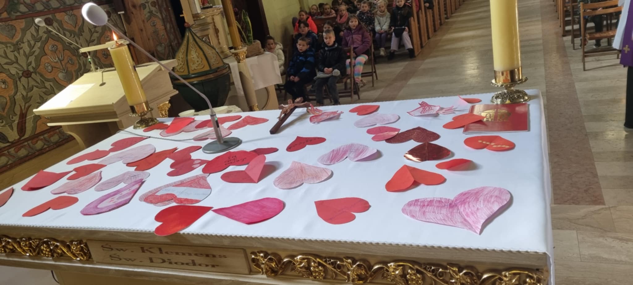 Drugiego dnia uczniowie, podzieleni na grupy, udali się do kościoła na kolejne spotkanie rekolekcyjne. Ksiądz zapytał, czy wywiązali się z powierzonych im zadań. Ci, którym się to nie udało, otrzymali kolejną szansę. Na następny dzień uczniowie mieli przygotować papierowe serce z wypisanym postanowieniem wielkopostnym oraz swoim imieniem i nazwiskiem. Rekolekcjonista wyjaśnił, że nie chodzi jedynie o rezygnację ze słodyczy czy innych przyjemności, ale przede wszystkim o pracę nad sobą – na przykład o bycie życzliwszym dla kolegów, okazywanie szacunku i pomoc innym. Podkreślał, jak ważne jest dbanie o relacje rodzinne i rówieśnicze, szczere wyrażanie uczuć oraz umiejętność przepraszania. Przytaczał również przykłady z własnego życia, pokazując, że w szkole nie zawsze wszystko układa się idealnie, ale kluczowa jest współpraca dziecka, rodziców i nauczycieli. Spotkanie zakończyło się wspólną modlitwą – Koronką do Bożego Miłosierdzia. Tego dnia uczniowie mogli także skorzystać z sakramentu pokuty i pojednania.