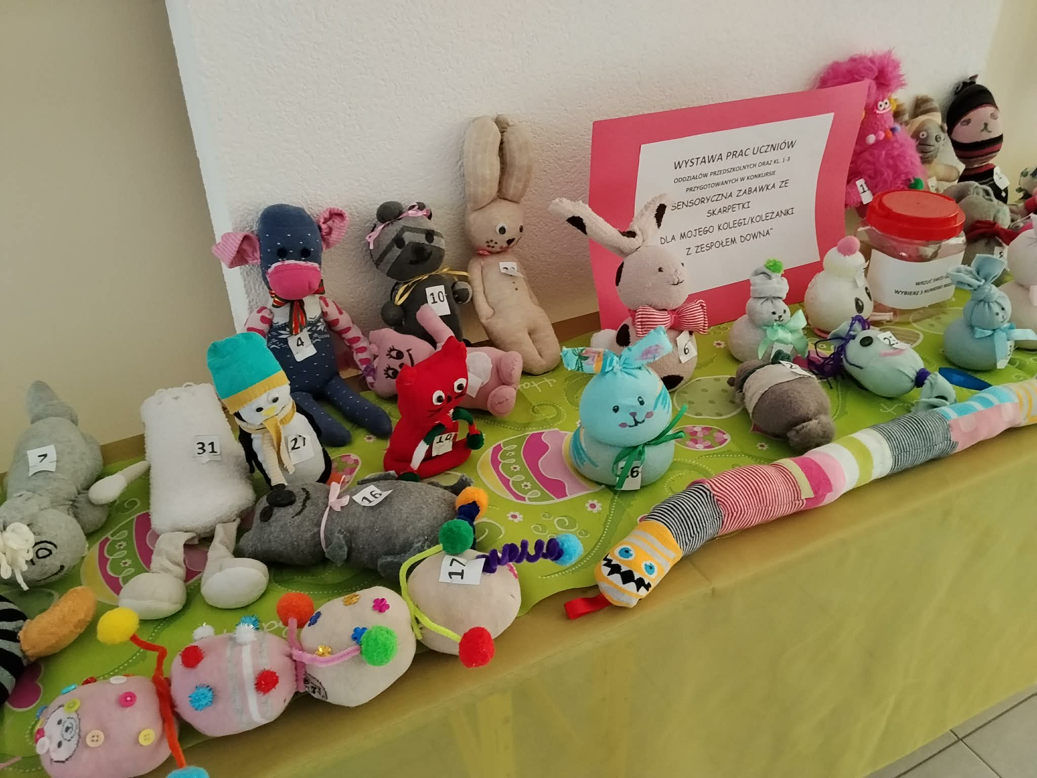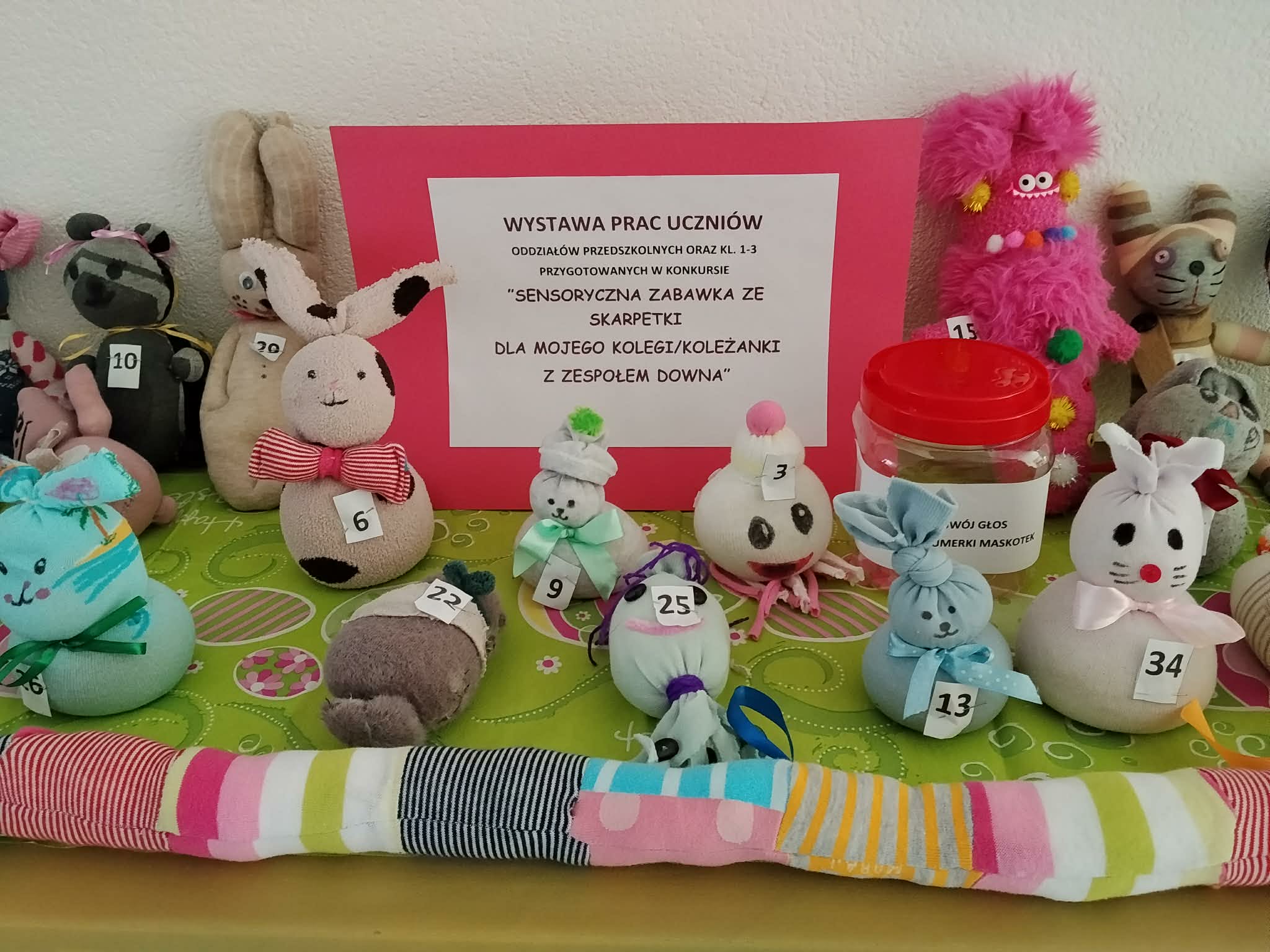 Wszystkie prace można było podziwiać na szkolnym korytarzu – nie tylko oglądać, ale również dotykać, co dodatkowo podkreślało ich sensoryczny charakter. Wykonane maskotki zostaną przekazane dzieciom z Zespołem Downa jako wyraz wsparcia, sympatii i solidarności.
